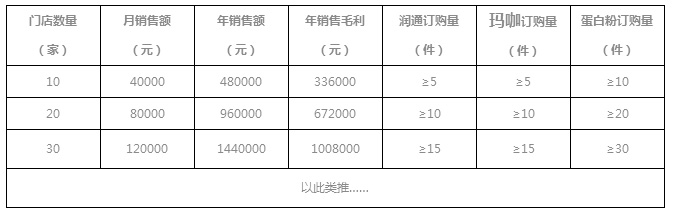 1、药店如果有 10 家门店,则须订购润通、玛咖、200g/400g蛋白粉产品各5件,同时须订购 10 件的蛋白质粉礼盒(药店进货量根据连