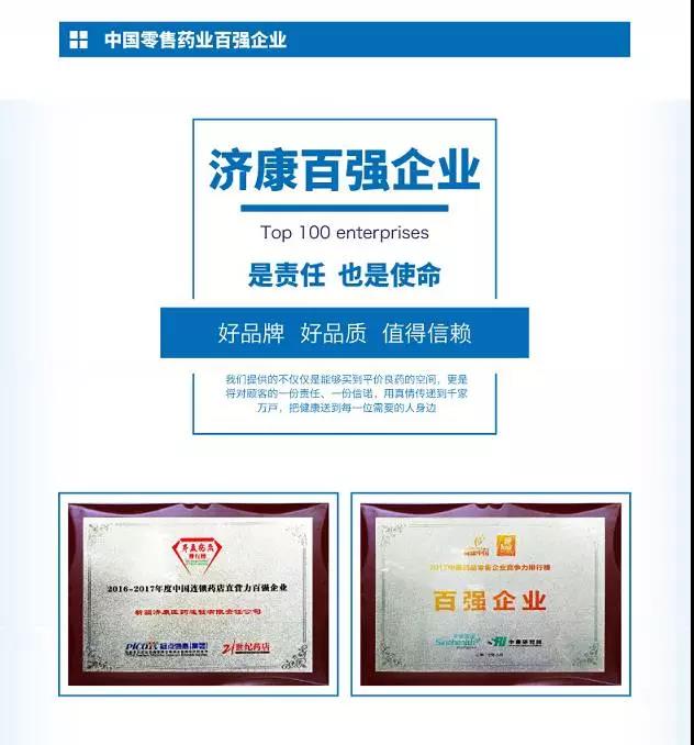 荣获2016-2017年度中国连锁药店直营力百强企业,2017年中国药品零售企业竞争力百强企业。济康大药房提供的不仅仅是能够买到平价良药的空间,更是将对顾客的一份责任、一份信诺,用真情传递到千家万户,把健康送到每一位需要的人身边。