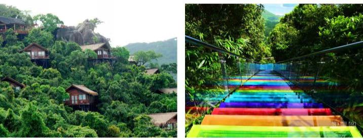 一进入园区,满眼绿色映入眼帘,热带气息扑面而来,高浓度负氧离子令人神清气爽!站在山顶,还可以俯瞰“天下第一湾”亚龙湾,绝美海景令人心旷神怡。