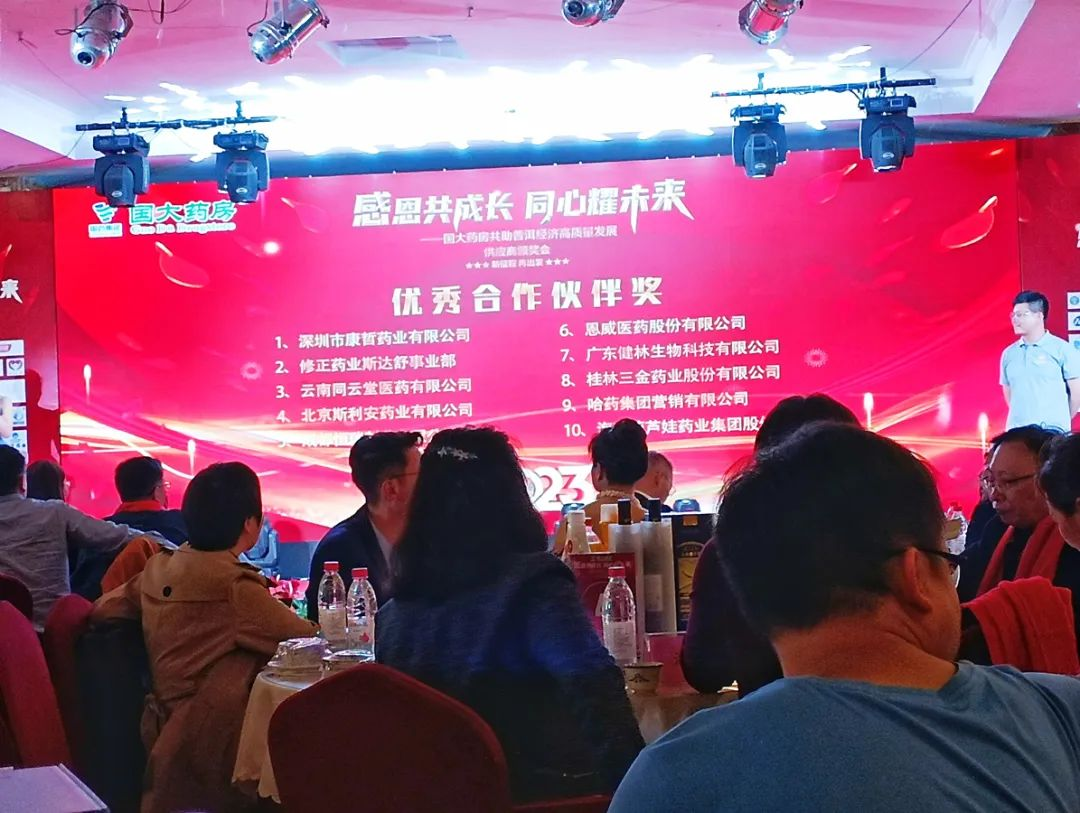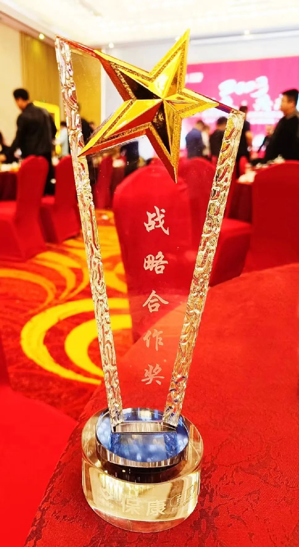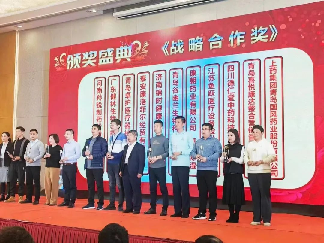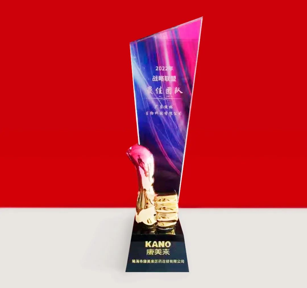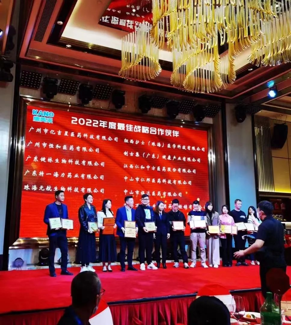 康美来药业集团旗下康美来医药连锁公司,是珠三角地区具有行业竟争力和领先水平的知名品牌企业。与健林也是合作10年的老客户了,一直引进健林的全系列产品合作,并销售火爆! 健林积极参与配合康美来全年活动开展,并凭借过硬的产品品质和差异化的营销服务,在多品牌的销售争霸赛中成功突围,年初在其2023年春茗会上,荣获“年度最佳战略合作伙伴奖”、“年度战略联盟最佳团队奖”双奖!