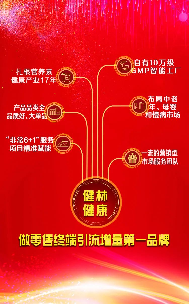 疫情放开,个人健康自我负责!后疫情时代,人们健康意识提升,全民增强免疫,膳食营养补充需求日渐增长,营养保健品的销售占比不断上升!未来营养素还将会有更大的提升空间,会如同美、日等发达国家一样全面融入人们的日常生活! 三年疫情,健林一直坚持与连锁形成命运共同体、大力投入不手软,共同走过了最艰难的时期!未来健林仍将不断升级产品和服务,继续与广大连锁客户精诚合作,携手奋进,共赢新目标!共创大健康产业繁荣,共护国人健康!